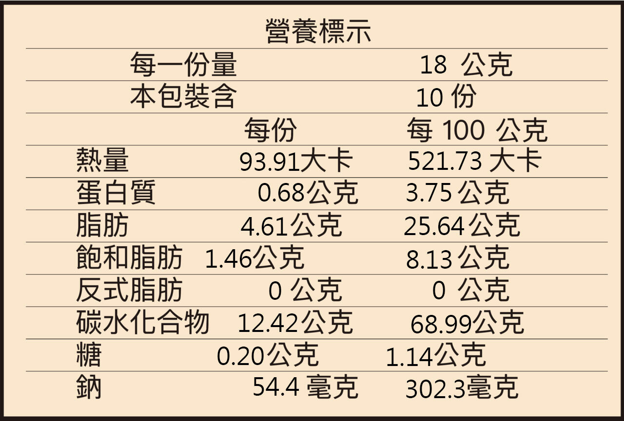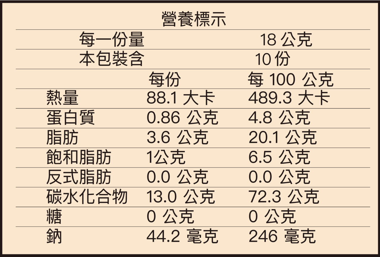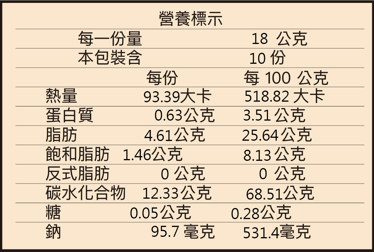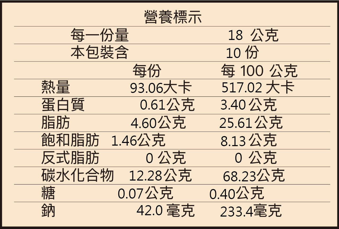 商品成份:純粹米香成份:台灣道地米、馬鈴薯澱粉、食用油